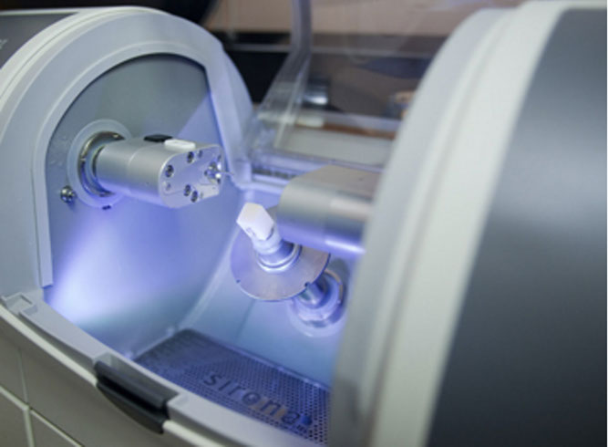Es un equipamiento de altísima tecnología desarrollado desde hace 20 años en la Universidad de Zürich, Suiza. Este equipo y sistema CAD//CAM permite realizar restauraciones dentales de variados tamaños y posiciones dentro de la boca, a través de una impresión digital de la cavidad bucal del paciente. Esto se traduce en un modelo digital en 3D que finalmente se envía a una fresadora, la cual operando sobre un cubo de porcelana del mismo color de los dientes de ese paciente permitirá restaurar la cavidad fracturada. Todo esto en una sola sesión, eliminando el largo proceso del laboratorio , con la mayor resistencia, estética y durabilidad.